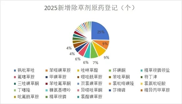 截至2025年9月4日,农药信息网可查的2025年除草剂原药新增登记证共67个,新增最多的为砜吡草唑,占比为1/4,可见其市场关注度之高。其后包括苯嘧磺草胺、精草铵膦铵盐两个灭生性除草剂。唑啉草酯、环磺酮、氟噻草胺、甲磺草胺、噁唑酰草胺、苯唑草酮登记数量也位居前列。